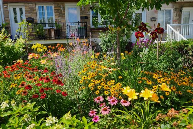 Cette photo ici-bas est un exemple d’une devanture de maison qui a toute fin pratique ne vous sert a rien avec un gazon sans vie, vous passez votre temps dans la cour arrière de toute façon…Même a l’arriere de la maison vous pouvez laissez des petits jardins naturels loin de votre balcon, cela éloignera les butineurs qui cherchent de la nourriture et vous laissez manger tranquille…